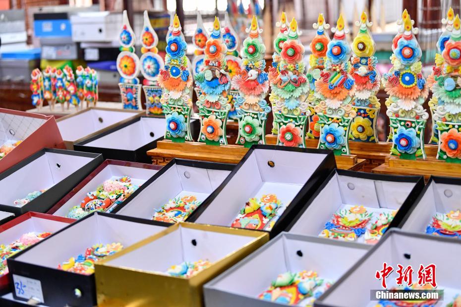 2月15日,手工藝人制作好的酥油花在拉薩八廓商場出售。隨著藏歷新年臨近,酥油花在拉薩年貨市場上熱銷。酥油花在藏語中稱為“孜扎”,是藏族民眾家庭中必備的年貨之一。