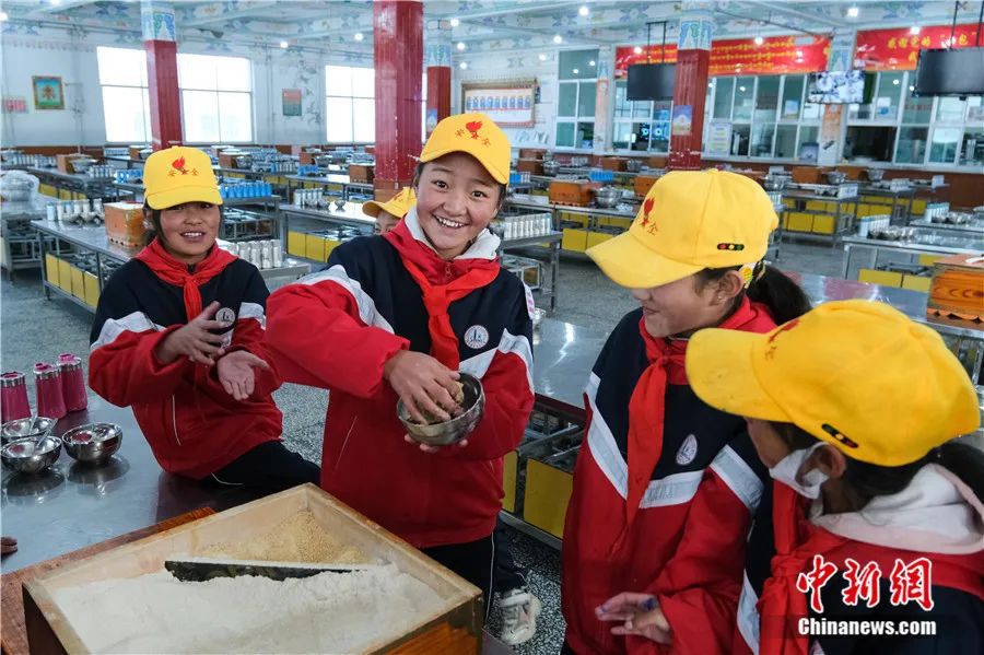 2023年10月13日,班戈縣中石化小學(xué)六年級一班尼瑪拉增(左二)在學(xué)校食堂捏糌粑,孩子們說她們的早餐便是以糌粑為主。中新社記者 江飛波 攝。