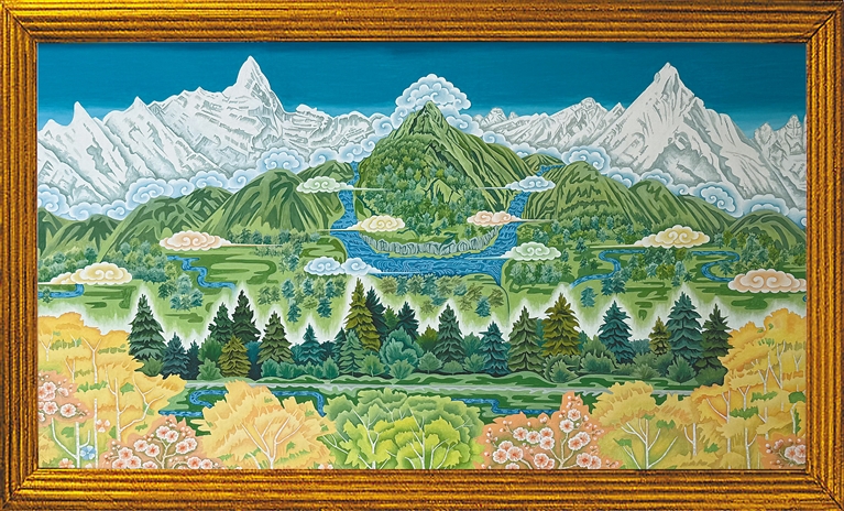 2020年,60歲的昂桑拜師一級(jí)美術(shù)師敬庭堯?qū)W習(xí)國(guó)畫,次年創(chuàng)作《雅魯藏布大峽谷》,雄渾地貌與水墨意境渾然天成。