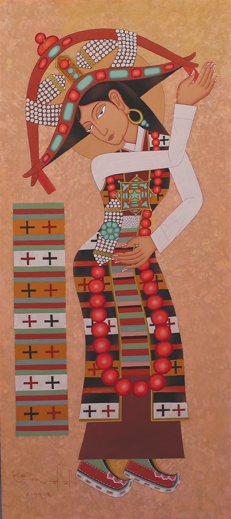 在昂桑“傳統(tǒng)當(dāng)隨時(shí)代”的藝術(shù)理念浸潤(rùn)下,徒弟們總能在傳統(tǒng)與當(dāng)代的碰撞中找到獨(dú)特的表達(dá)坐標(biāo):來(lái)自日喀則的藝術(shù)家多吉次旺,早年被昂桑畫作中藏文元素與抽象色塊的融合所震撼。如今在拉薩創(chuàng)辦工作室的他,正將藏文書法的中鋒筆觸解構(gòu)為流動(dòng)的視覺符號(hào)——烏金體的頓挫韻律幻化為色彩的潮涌,在畫布上重現(xiàn)古老史詩(shī)的“當(dāng)代心跳”;而主演《文成公主》實(shí)景劇的馮佳,這位四川傳媒大學(xué)表演系的畢業(yè)生,跟隨昂桑學(xué)畫四年,已能在《文成公主》系列中將唐卡礦物顏料的莊重與波普藝術(shù)的色塊切割并置,讓歷史人物既保有壁畫般的莊重感,又流淌著屬于時(shí)代的視覺節(jié)奏。