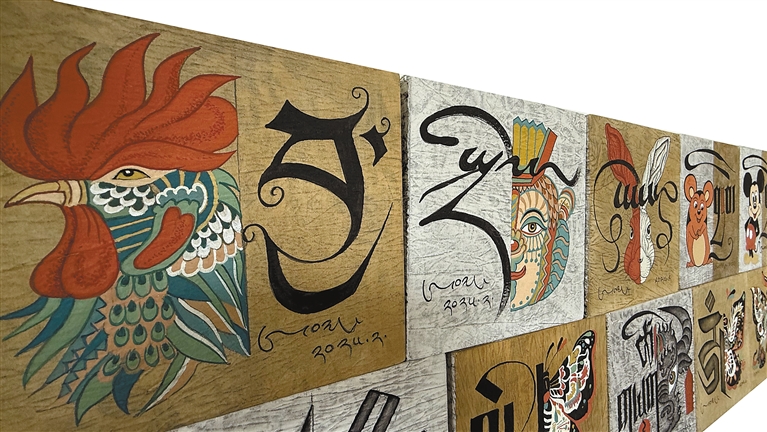 在昂桑的工作室中,《一日一畫》系列尤為醒目:藝術(shù)家采用布面重彩技法,讓唐卡礦物顏料與現(xiàn)代丙烯顏料滲透交融,傳統(tǒng)吉祥紋樣與幾何抽象圖案共生。韓書力評(píng)價(jià):“他讓千年顏料與當(dāng)代審美共振,完成傳統(tǒng)藝術(shù)的‘基因重組’?!?/p>