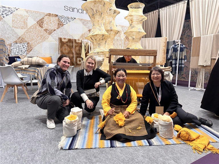 上海市援藏干部人才引進(jìn)的沙涓攜西藏江孜氆氌亮相2024年法國(guó)巴黎Maison&Objet展會(huì)。