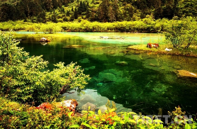 少女般的冰湖,藏于青山綠樹(shù)中,伏于深林密草內(nèi),異常迷人。站在不同的視角看冰湖,同一水域,卻有不同的顏色,綠中透著藍(lán),藍(lán)中泛著橙、橙中映著赤、赤中蘊(yùn)著黃,斑斕奪目,攝人心魄。湖水周圍的花草樹(shù)木長(zhǎng)得異常茂盛,五光十色的倒影使湖水更加瑰麗。
