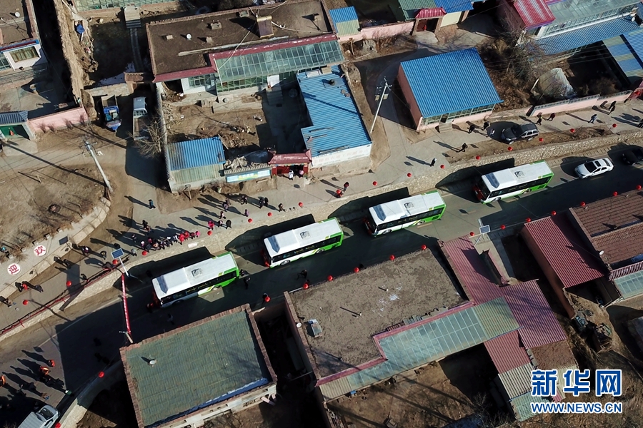 2018年1月16日,青海省首條交通扶貧公交專線在卡陽村開通運(yùn)營,四輛嶄新的新能源公交車統(tǒng)一發(fā)車。新華網(wǎng) 潘彬彬攝