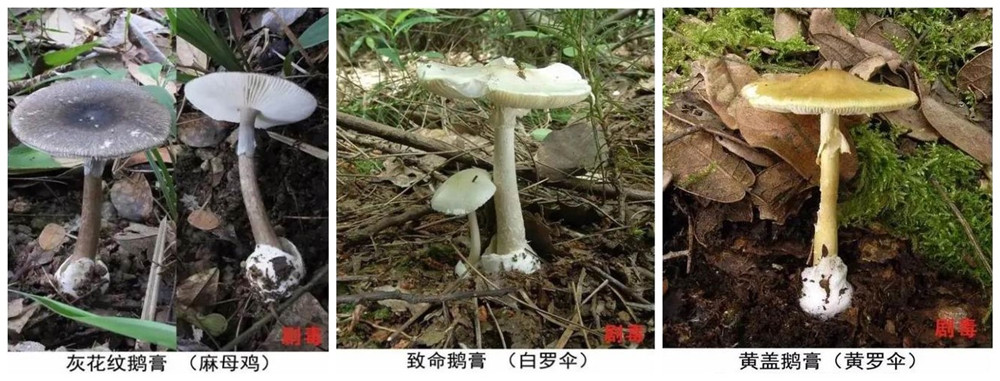 圖為劇毒鵝膏菌中的部分成員 圖片來源:云南省衛(wèi)生健康委員會(huì)、云南省疾病預(yù)防控制中心發(fā)布海報(bào)截圖拼接