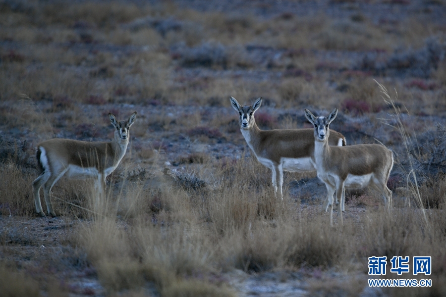 四只鵝喉羚在都蘭湖國家濕地公園內(nèi)活動(dòng)。(11月21日攝)新華網(wǎng) 潘彬彬攝
