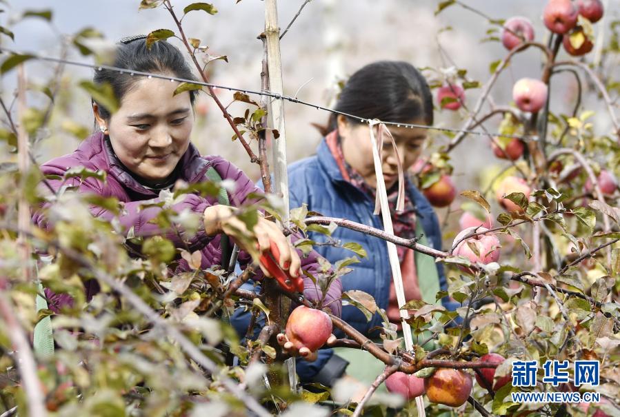 在林芝市米林縣羌納鄉(xiāng)西藏林芝現(xiàn)代蘋果標(biāo)準化園區(qū),務(wù)工人員在采摘蘋果(11月22日攝)。新華社記者 張汝鋒 攝