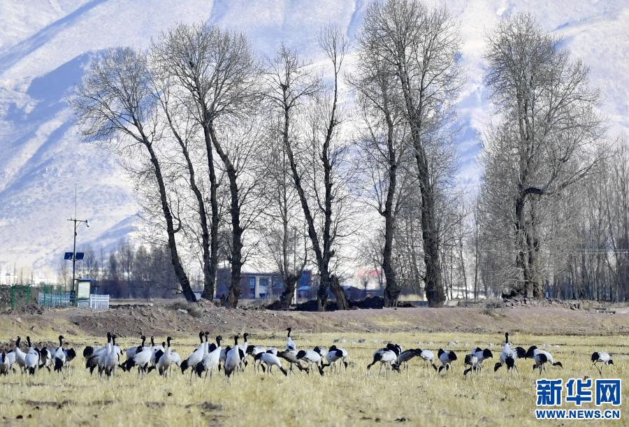 林周縣黑頸鶴自然保護區(qū)里的黑頸鶴(12月12日攝)。新華社記者 張汝鋒 攝