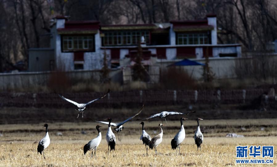 棲息在林周縣卡孜鄉(xiāng)農田里的黑頸鶴(12月12日攝)。新華社記者 張汝鋒 攝