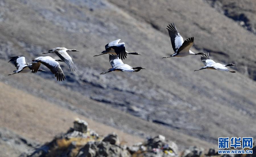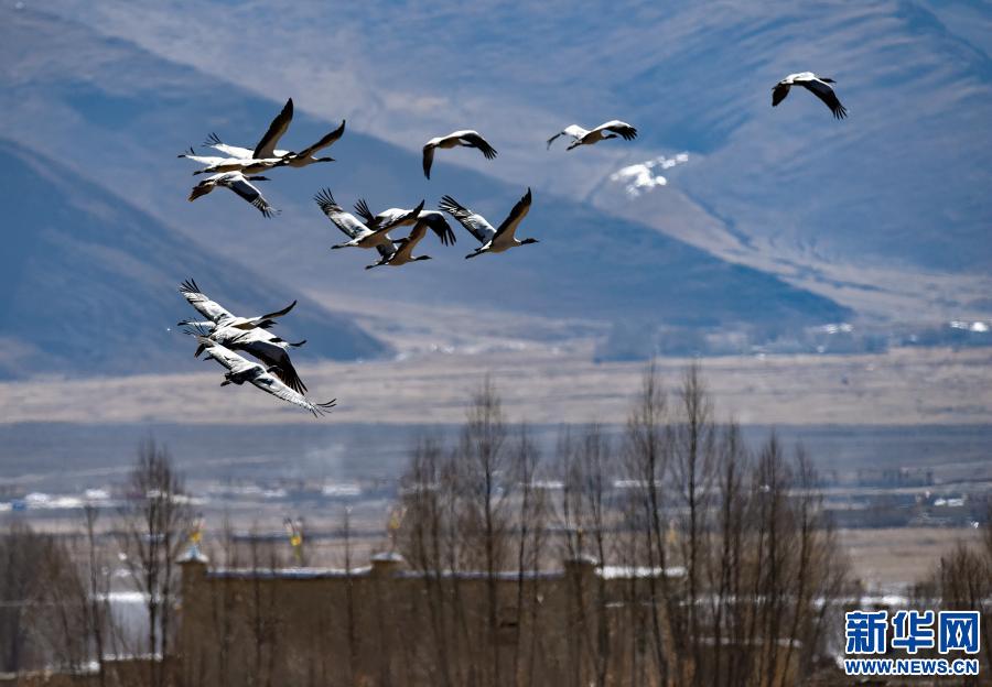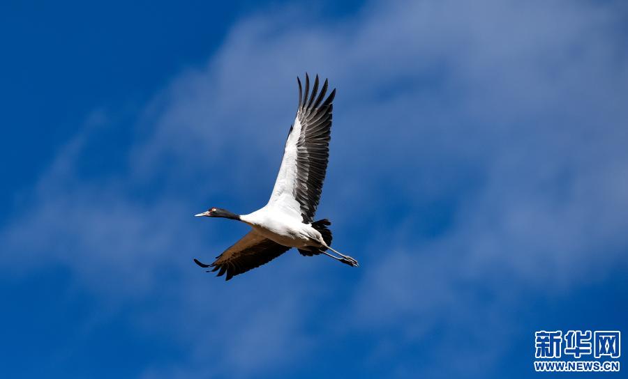 黑頸鶴在林周縣黑頸鶴自然保護區(qū)上空飛翔(12月12日攝)。新華社記者 黃豁 攝