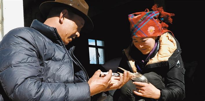 “你看,這只黑頸鶴是十幾天前我從田間救回來的,當時它的翅膀和右腿都受了傷,奄奄一息,我還擔心救不活它。我把消炎藥放入酥油中攪拌制成膏藥,涂抹在它的傷口上,并給它喂了口服消炎藥,白天就把它放到院子里,讓它鍛煉受傷的腿腳。通過細心照料它恢復(fù)得很好,等它痊愈了,我就把它放歸大自然?!?9歲的巡護員多布杰高興地說。