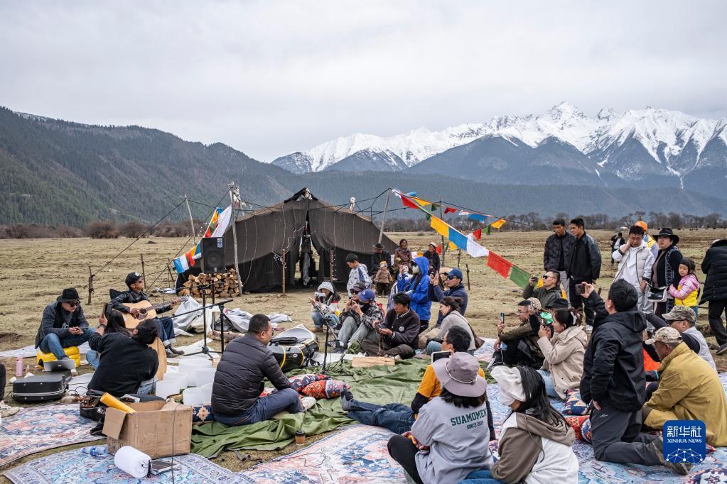 4月15日,在“巴松措漂流露營(yíng)大會(huì)”現(xiàn)場(chǎng),游客在觀看文藝表演。新華社記者 曹檳 攝