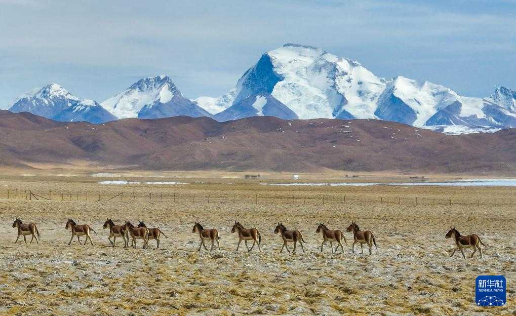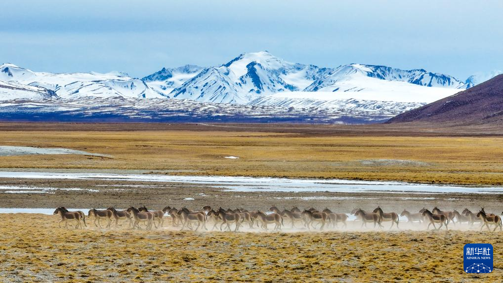 3月29日,藏野驢在西藏阿里地區(qū)普蘭縣境內(nèi)雪山下奔跑(無(wú)人機(jī)照片)。新華社發(fā)(劉曉東攝)