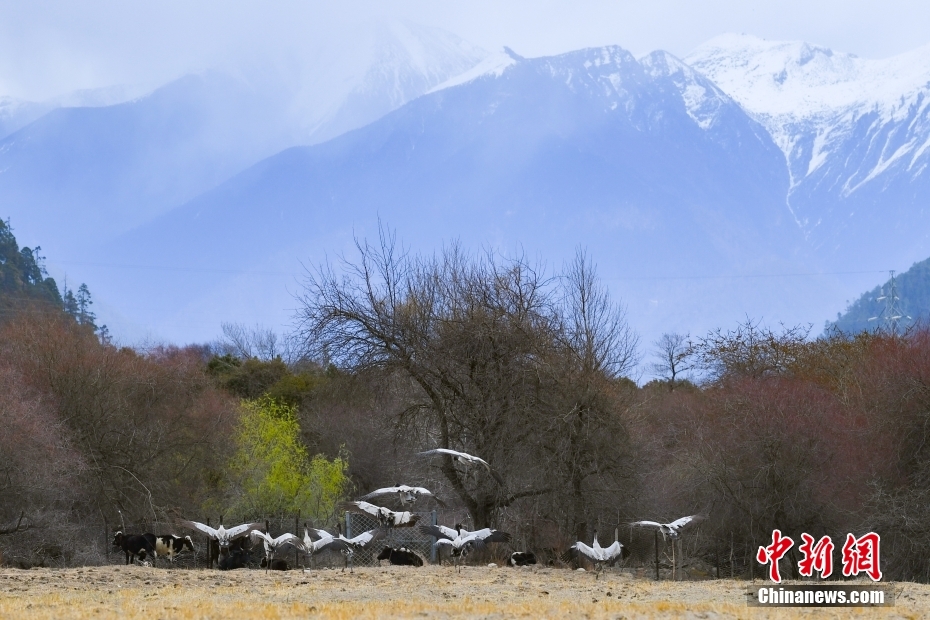 3月30日,在西藏林芝市巴宜區(qū)更章門巴民族鄉(xiāng),黑頸鶴與周邊的村莊、桃花、雪山融為一體,成為春日里的一道靚麗的風(fēng)景線。圖為黑頸鶴在田間覓食嬉戲。中新社記者 貢嘎來松 攝