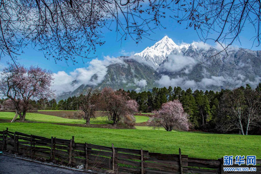 圖為西藏波密縣扎木鎮(zhèn)崗村雪山腳下盛放的桃花。新華網(wǎng)發(fā) 阿旺仁青 攝