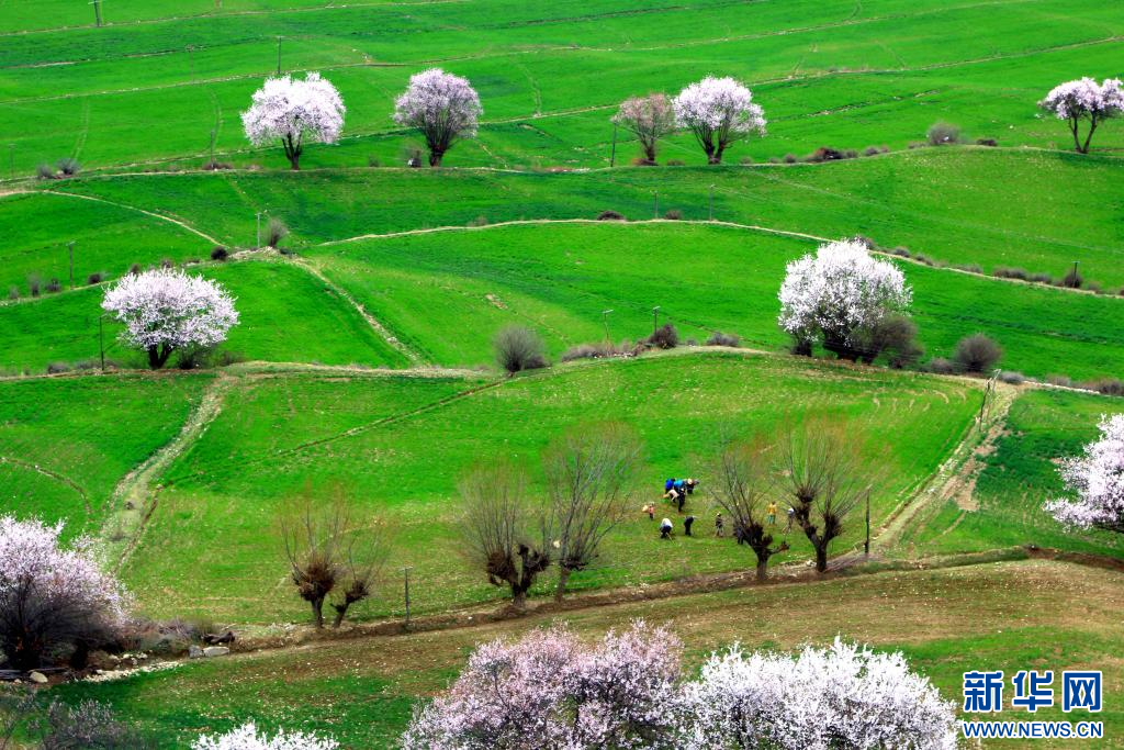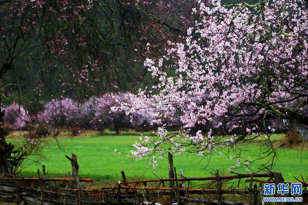 圖為西藏波密縣傾多鎮(zhèn)巴康村內(nèi),桃花映襯下的綠草。新華網(wǎng)發(fā) 阿旺仁青 攝