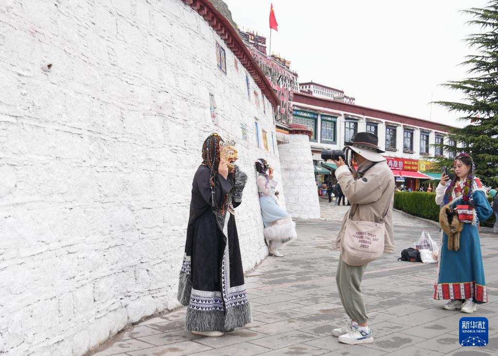 5月5日,游客在布達拉宮周邊拍照留念。新華社記者 丁汀 攝