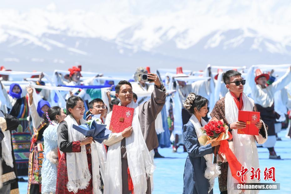 5月19日,隨著氣溫升高,西藏納木錯(cuò)解凍開湖,迎接即將到來(lái)的旅游旺季。納木錯(cuò),藏語(yǔ)意為“天湖”。圖為納木措開湖儀式上舉辦集體藏式婚禮。