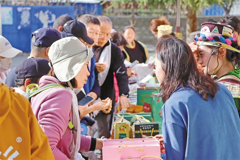 游客在選購(gòu)?fù)撂禺a(chǎn)。謝筱純 攝