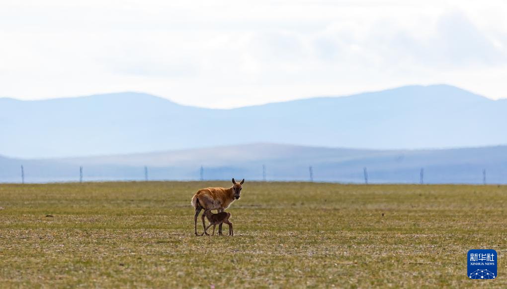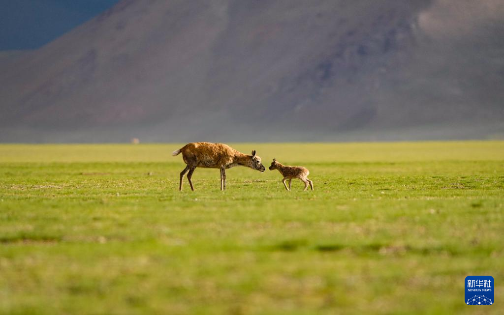 魯確塘草原上,藏羚羊媽媽守護著剛出生的小藏羚羊(6月16日攝)。新華社記者 旦增尼瑪曲珠 攝