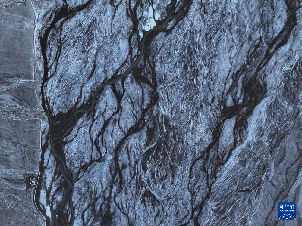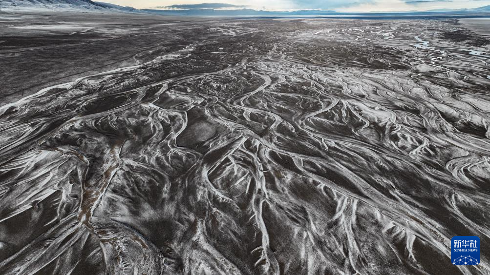 藏羚羊排隊走過甜水河河床,留下整齊的印跡(6月15日攝,無人機照片)。新華社記者 晉美多吉 攝