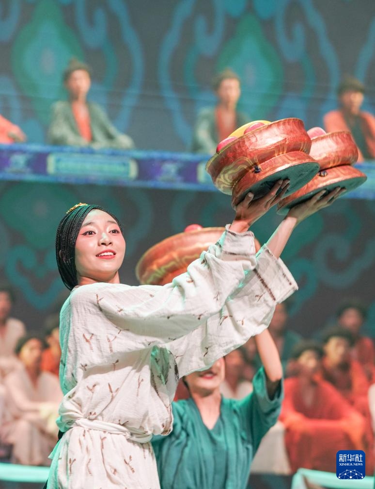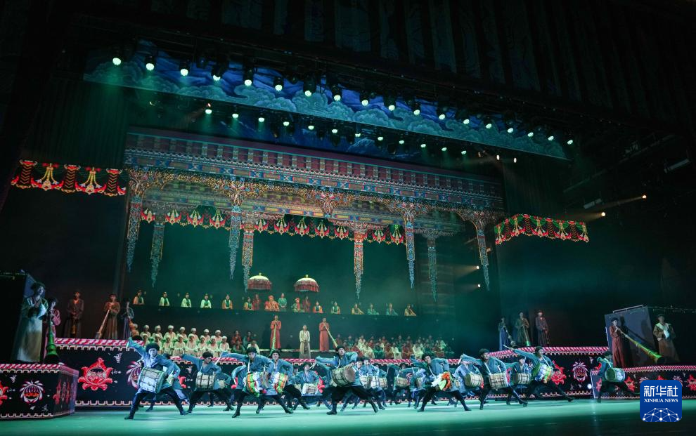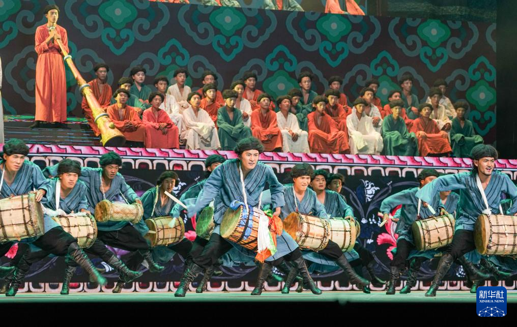 7月19日,在西藏拉薩《緣起象雄·古格遺風(fēng)》情景歌舞詩演出現(xiàn)場,演員在表演節(jié)目《鼓樂喧天》。新華社記者 晉美多吉 攝 ??