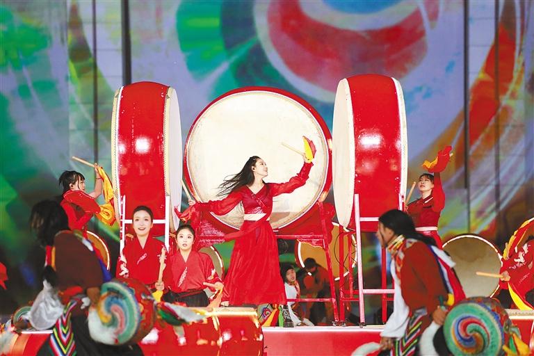 共振共鳴中國鼓,交流交融民族情。在激昂的鼓聲和大開大合的舞姿中,開幕式序曲《大江之鼓》緩緩呈現(xiàn)在所有人面前。喆友打擊樂團、山南市瓊結久河卓舞隊等隊伍的近70名鼓手同臺獻藝、默契配合,讓鼓聲共振、情感共鳴,展現(xiàn)了激情洋溢、魅力無限的中華鼓文化。