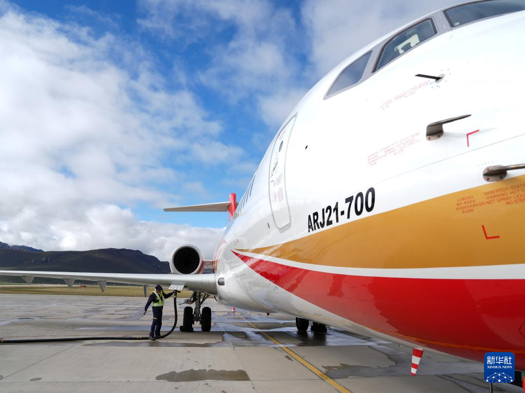 9月21日,國產(chǎn)商用飛機(jī)ARJ21停放在西藏拉薩貢嘎國際機(jī)場停機(jī)坪上。新華社記者 丁汀 攝
