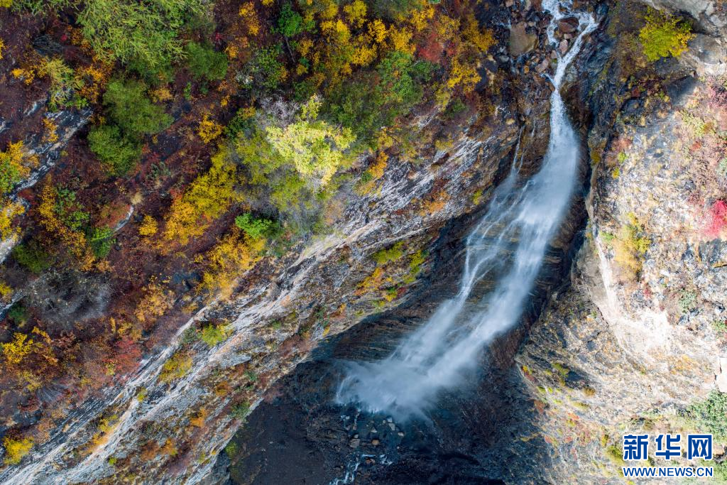 10月11日,在西藏林芝市波密縣境內(nèi)川藏公路沿途拍攝的瀑布(無(wú)人機(jī)照片)。新華網(wǎng) 旦增努布 攝