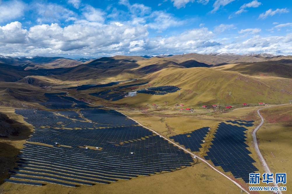 10月19日拍攝的華電西藏江達牧光互補光伏發(fā)電項目。該項目位于西藏自治區(qū)昌都市江達縣青泥洞鄉(xiāng)索日村,總裝機20兆瓦,每年可發(fā)出清潔電能3000萬千瓦時,可減少二氧化碳排放3萬噸。新華網(wǎng) 旦增努布 攝