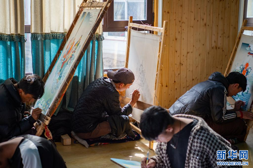 10月17日拍攝的卡若區(qū)嘎瑪鄉(xiāng)的一家唐卡畫院。該鄉(xiāng)2020年被國家文化和旅游部命名為“中國民間文化藝術(shù)之鄉(xiāng)”。在嘎瑪鄉(xiāng)不少當?shù)厝罕娛来鷱氖绿瓶ɡL畫、金屬鍛造、石刻等民族手工藝品制作,幾乎家家有工匠、戶戶有傳人。新華網(wǎng) 旦增努布 攝