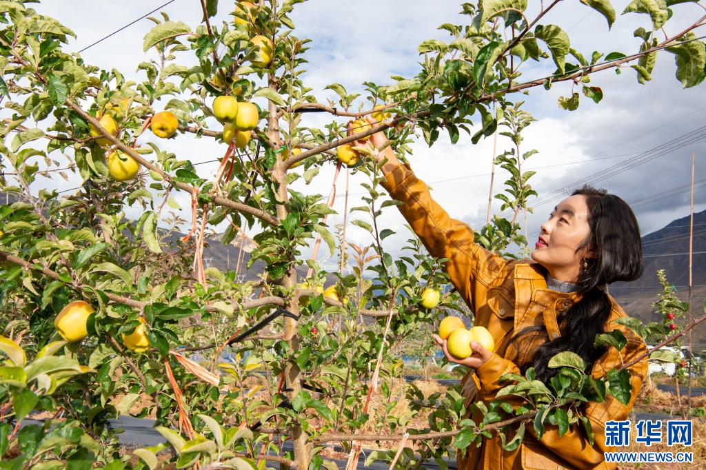 10月12日,西藏昌都市八宿縣白瑪鎮(zhèn)沙木村村民嘎桑曲珍在蘋果園區(qū)采摘。該園區(qū)于2023開始陸續(xù)掛果,預(yù)計2025年進入豐產(chǎn)期,今年園區(qū)蘋果產(chǎn)量達140余噸左右。目前全縣種植蘋果35萬余株,總面積4848.95余畝。新華網(wǎng) 旦增努布 攝