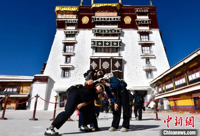 隨著2024冬游西藏的啟動(dòng),西藏所有A級(jí)景區(qū)(寺廟景區(qū)除外)免費(fèi)游覽,布達(dá)拉宮也成為冬游西藏?zé)衢T游覽地之一。圖為11月1日,來自四川的信眾在布達(dá)拉宮拍照留念。中新社記者 李林 攝
