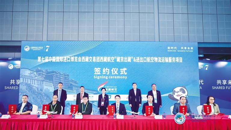 11月5日,備受矚目的第七屆中國(guó)國(guó)際進(jìn)口博覽會(huì)在上海隆重開幕。西藏航空作為西藏自治區(qū)進(jìn)博會(huì)交易團(tuán)成員亮相此次進(jìn)博會(huì),并成功舉辦了“藏貨出藏”及進(jìn)出口航空物流運(yùn)輸服務(wù)項(xiàng)目的簽約儀式及推廣活動(dòng)。本次活動(dòng)得到了西藏自治區(qū)政府商務(wù)廳的大力支持。西藏航空黨委委員、副總經(jīng)理張兵兵出席簽約儀式。