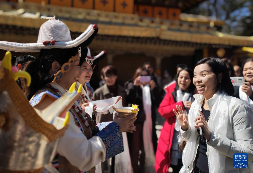2月20日,歡迎儀式上當?shù)赜e人員為香港游客敬獻香甜的青稞酒。 新華社記者 春拉 攝