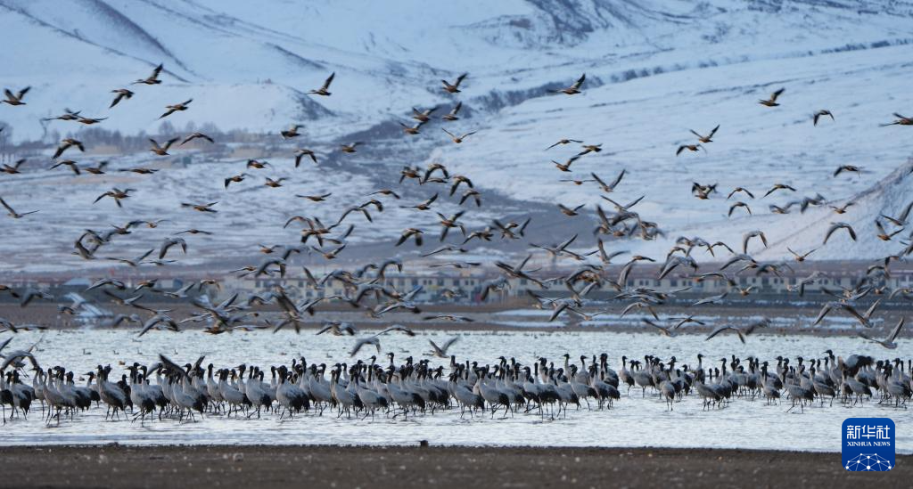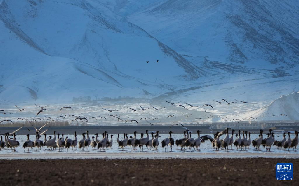 西藏自治區(qū)拉薩市林周縣平均海拔約4200米,是黑頸鶴的主要越冬地之一。一場(chǎng)冬雪,將林周縣虎頭山水庫(kù)染成一片銀白,黑頸鶴仿佛是這潔白舞臺(tái)優(yōu)雅的舞者。