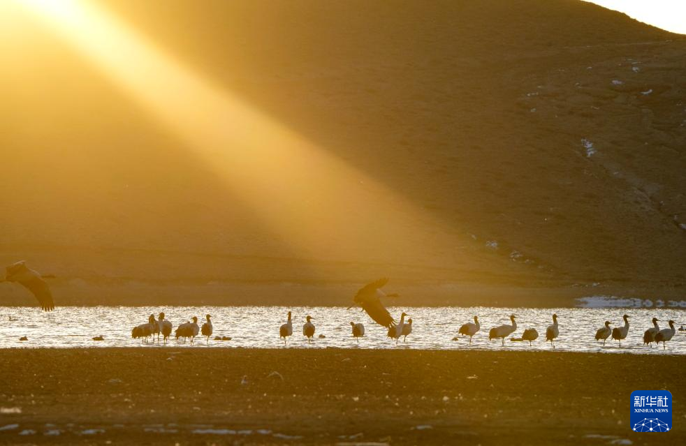 2月20日清晨,第一縷陽(yáng)光照耀在西藏拉薩市林周縣越冬的黑頸鶴身上。新華社記者 晉美多吉 攝?