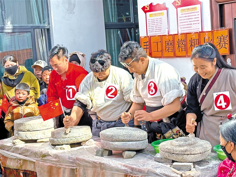 圖為比如縣“鄉(xiāng)村振興 那曲奮進(jìn)”手工磨糌粑比賽現(xiàn)場(chǎng)。 記者 趙書彬 萬靖 攝