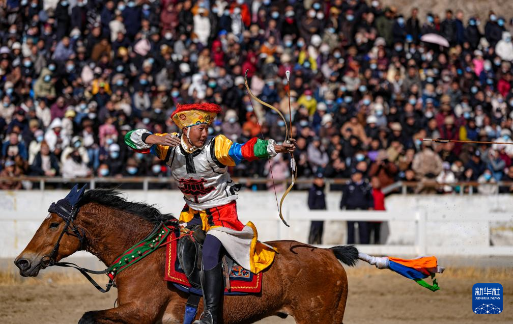 3月2日,馬術(shù)隊(duì)員在表演傳統(tǒng)馬術(shù)項(xiàng)目馬上射箭。新華社記者 晉美多吉 攝??