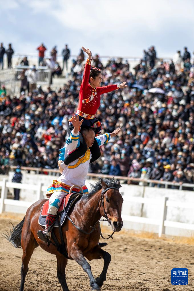 3月2日,馬術(shù)隊(duì)員在表演傳統(tǒng)馬術(shù)項(xiàng)目。新華社記者 晉美多吉 攝??