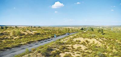登上杭錦旗第一條穿沙公路旁的防火瞭望塔,四下遠(yuǎn)望,只見(jiàn)公路兩側(cè)的沙地,被沙生植物覆蓋起來(lái)。這條全長(zhǎng)115公里的黑色柏油路,從杭錦旗錫尼鎮(zhèn)出發(fā),猶如一把利劍,直插庫(kù)布其沙漠腹地,硬生生將沙漠?dāng)r腰劈斷。