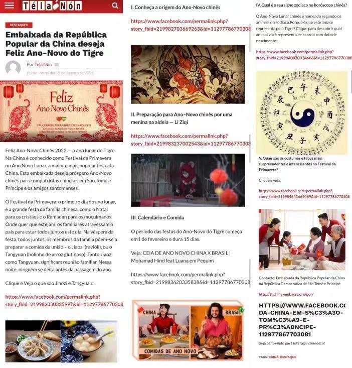 春節(jié)前夕,中國駐圣多美和普林西比使館在當地主要門戶網站特拉儂網(Téla Nón)設立虎年春節(jié)專欄,向廣大旅圣普僑胞、中資機構和留學生以及圣普人民送上新春祝福,并介紹中國春節(jié)習俗趣事,掀起迎接中國新年的熱潮。